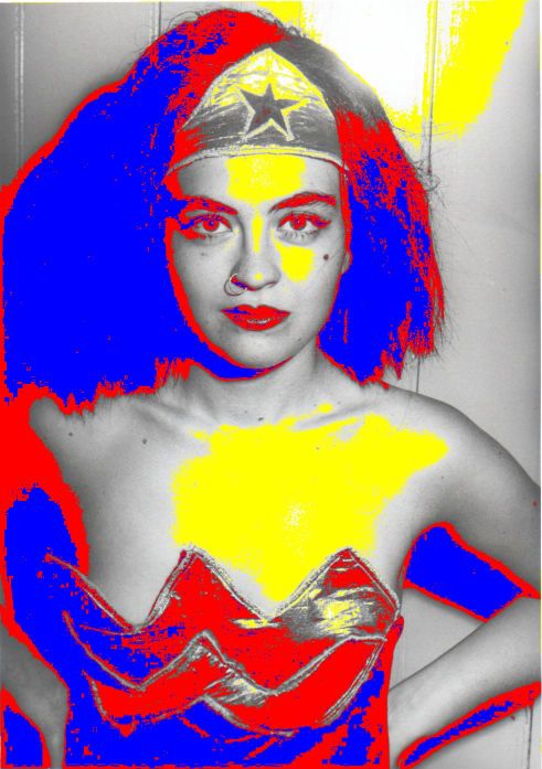 “Well I've taken characters that already exists, like Wonder Woman, and Barbie and Lillith, who is the first wife of Adam, she is in the Jewish texts, and then I've invented characters like Tampon Woman, Cyber Which?, and the Drag King. There are more: The Preacher, The Corsetiere and the Prose-titute [sic].”