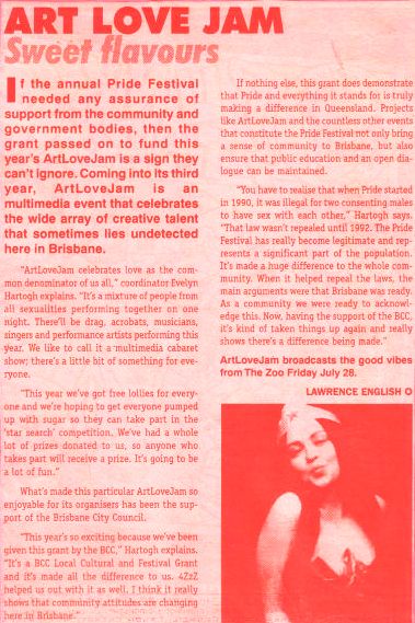 “When Brisbane performance artist Evelyn Hartogh first conceived of Art love Jam (pictured) a gathering of performance poets and musicians with a focus on gay and lesbian artists she couldn’t have imagined the shape it would take. The first Art Love Jam in 1998 was a low kep but successful event that took place at the Hub café. Word of the gathering ogt around to event co-ordinator James Lees, who picked it up and squeezed it into a larger venue, the Zoo. The second Art Love Jam featured physical theatre performers, acrobats and electronic artists, as well as some very talented writers. By lat year, the Brisbane city council had got wind of the event and donated a government grant to Evelyn so she could pay the artists involved. Art Love Jam 3 was a smash. The Zoo was bursting with performers old and new and punters paying the bills. Art Love Jam 4 is tipped to be the biggest yet and with performers such as poet Dorje Norbu and singer Stephanie Lim, Evelyn concept should happily spin further out of control. The event will be at the Zoo, 711 Ann Street, Fortitude Valley on Friday night”