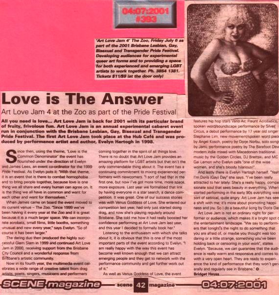 All you need is love. Art Love Jam is back for 2001 with its particular brand of fruity, frivolous fun. Art Love Jam is an annual experimental cabaret event run in conjunction with the Brisbane Lesbian, Gay, Bisexual and Transgender Pride Festival. The first Art Love Jam took place in the Hub Café and was produced by performance artist and author, Evelyn Hartogh in 1998.