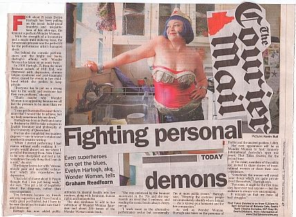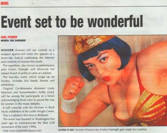 "Perhaps her best known performance was vacuuming the Queen St Mall while dressed as Wonder Woman … Among the events at the SOOB festival is Razor Blades And Flouro Wigs a panel discussion on the ‘out there’ nature of live performance featuring … Queensland Pride’s own Wonder Woman, Evelyn Hartogh”