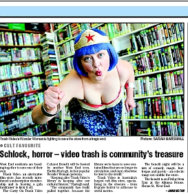 “West End residents are banding together to save one of their own. Trash Video, an alternative film store, has recently introduced a subscription membership and is hosting a gala fundraiser to kick it off. The Carry On Trash Video Cabaret Benefit will be hosted by another West End icon, Evelyn Hartogh, in her popular Wonder Woman persona. “Keeping alive Trash Video’s library is keeping alive our cultural history,” Hartogh said. “The community has really pulled together, because the library we’re keen to save contains films that are no longer in circulation and may otherwise be lost to the world.” Trash Video is Australia’s largest cult film store, specialising in the obscure – from B-grade horror to arthouse to world movies.