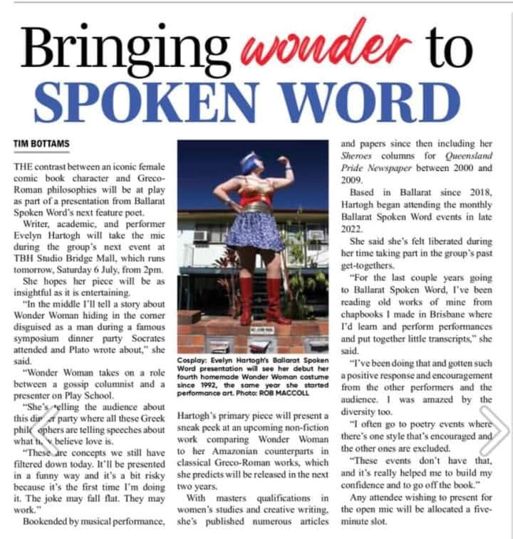 EV: well yeah there is never too much study – so yeah I have constantly publishing during this, while I was doing my second masters I became the Arts Editor at Queensland Pride Newspaper, & that's when I started my Pop Cult Sheroes column, so as well as a lot of reviewing of books, films, & theatre, I had a monthly, then fortnightly, column in Qld Pride Newspaper, & then I started doing a monthly column in LOTL, Lesbians on the Loose, that was called Pop Tarts, they were both essentially about contemporary [mainly] twentieth century women who were warriors, who were non-feminine archetypes, or men, like someone for instance like Doctor Who who is not your usual chauvinistic man, I classed him as a Shero. The interesting thing about that period, we are talking about the 2000s, which was the main time I was doing the Sheroes, is that there is lots of revival of famous characters, like there was a new Bewitched, a new Elektra, so that gave me lots of scope to write columns, not just ones that looked back at retro TV series, & characters, but were also relating a revamp to the characters' history, their canon, which I'm guessing is something you might be interested in today on Wonder Woman.