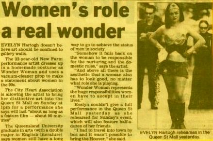 The 22-year-old New Farm performance artist dresses up as Wonder Woman and uses a vacuum cleaner as a prop to make a statement about women in the 90s.