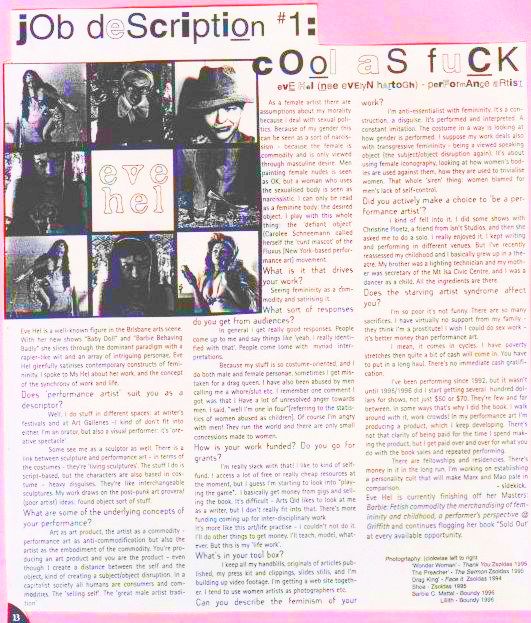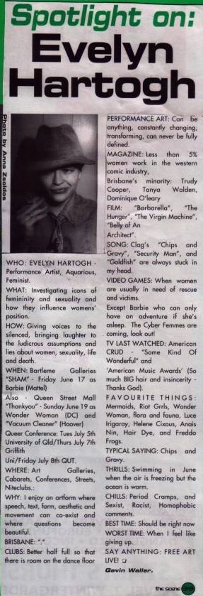 “Evelyn Hartogh is a Brisbane performer and writer. Following three successful editions of SOLDOUT comes BUY her second collection of photographs, performances, and essays (1992-97). Each book is handmade, bound, signed, numbered and very colourful Evelyn's performances and essays focus on examining and poking fun at the hetero-patriarchyand its notion(s) of femininity. Many identities and different voices carry Evelyn's “anger, sarcasm and cathartic satire” to her audiences. She draws from mythology and iconography to focus on how women are commodified and fetishised and comments on the silencing of queers. In “Buy” she showcases some of her creations: Baby Doll, Tampon womanand Cyberwhich, as well as giving space to some of my favourite divine/powerful women: Lillith, Athene, Aphrodite and Wonder Woman. “Buy” is very well paced switching between academic essays, short observations, photography and comical satires. These are spread throughout three sections, “Barbie Fetish Commodity”, “Identity and Artiface” and “Silences”. Being an editor, I couldn't help but pick up on a few syntactical errors, but these do contribute to the homemade, zine-y feel of the book. Evelyn says she wants to “confuse, shake-up and disturb” her audiences” and “infect them with uncertainty till they react with more questions”. If you enjoy being challenged and wanna bomb the partiarchy (or if you dig the patrirachy and need a big fucken wake-up call), “Buy” is for you.”
