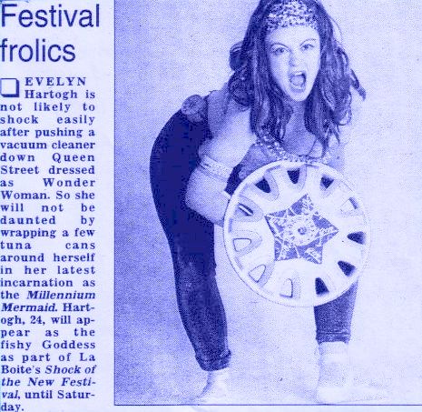 "An eclectically clad modern mermaid … innovation, invention and imagination are the priority … MILLENIUM MERMAID [PHOTO: Evelyn Hartogh]: an interact piece combining stamps, sculpture and slide projection, which questions cultural depictions of female sexuality, autonomy and power”