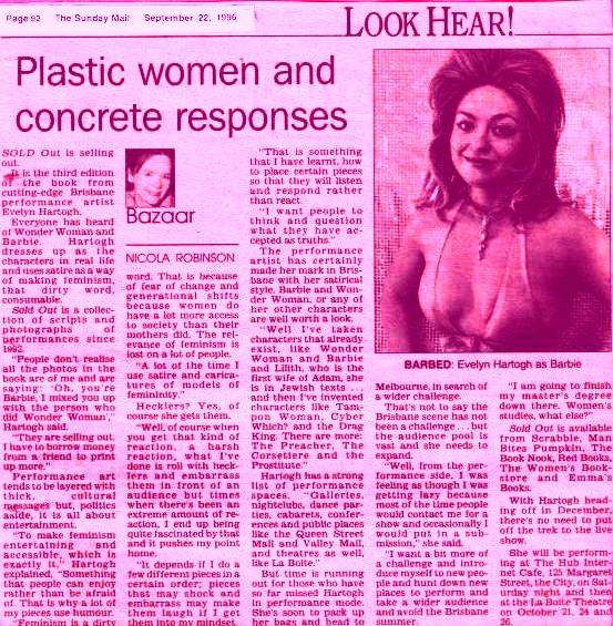 1996 Sept 22 NICOLA ROBINSON Plastic Women and Concrete Responses SUNDAY MAIL p.92.