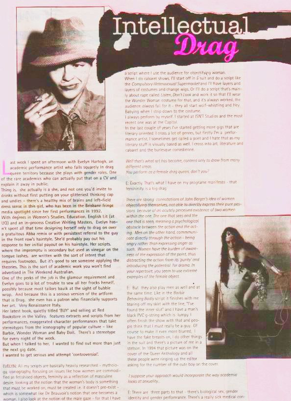 With degrees in Women's Studies, Education, English Lit (at UQ) and an in-process Creative Writing Masters, Evelyn hasn't spent all that time designing herself only to drag on over a gratuitous Abba remix or persistent referral to the guy in the front row's hairstyle. Her scripts where the impromptu is secondary but used as vinegar on the tongue lashes, are written with the sort of intent that requires footnotes. But it's good to see someone applying the theories. This is the sort of academic work you won't find advertised in The Weekend Australian.