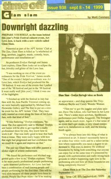“I was working as one of the event co-ordinators for the Pride Festival,” James recalls. “One of the events I helped co-ordinate was Art Love Jam, which Evelyn had produced for the '98 festival. It went really well [this year]. I think it was one of the highlights.